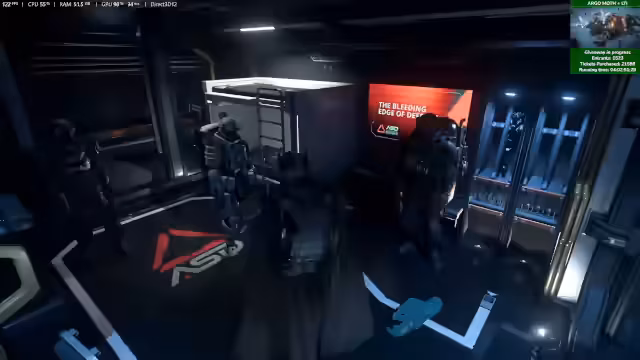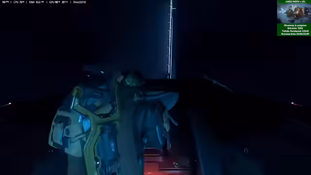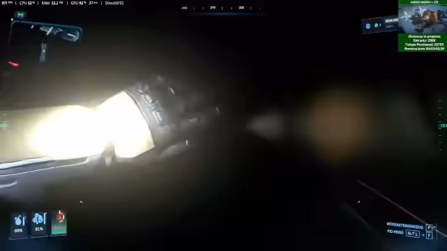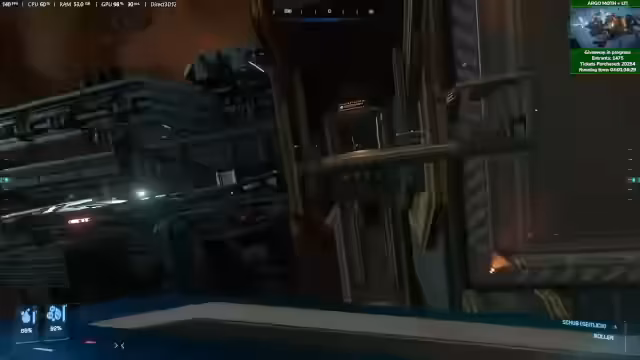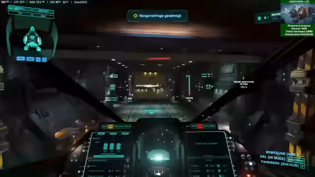 01:02:57Nach dem Kauf der Waffen und Munition werden die Vorbereitungen für eine Salvage-Mission getroffen. Es wird eine Medic Pisces als Respawn-Schiff geholt. Der Streamer und sein Flügelpartner Wolf starten den Flug ins AOI-Vendor-Gebiet. Während des Fluges wird eine Diskussion über die Performance mit DLSS geführt. Der Streamer analysiert, dass die Leistung der CPU limitiert ist und die 5090-Grafikkarte bei 2K-Auflösung nicht voll ausgelastet wird, weshalb DLSS wenig bringt.