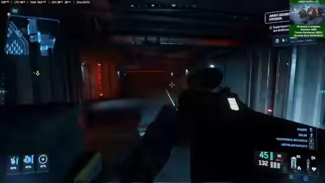 03:24:53Nachdem eine feindliche Gladius die Idris durch Rammen und Bombenabwurf schwer beschädigt hat, beginnt der Streamer eine umfassende Reparatur. Er nutzt die Ingenieursfunktion, um Fuses auszuschwechseln, Relays zu reparieren und Brände mit den an Bord befindlichen Feuerlöschern zu bekämpfen. Dabei stellt er fest, dass die Schiffskomponenten eine zu geringe Haltbarkeit aufweisen und kritisiert den Schaden, der durch den Angriff verursacht wurde.