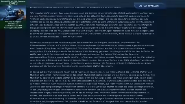 04:20:28Der Monatsreport wird analysiert, wobei die wichtigsten Themen herausgesucht werden. Ein Zuschauer wirft vor, Clickbait zu betreiben, was zurückgewiesen wird, da interessante Titel nicht gleich Clickbait seien, solange sie den Inhalt korrekt widerspiegeln. Clickbait wäre es, reißerische Titel zu verwenden, die nicht zum Inhalt des Videos passen. Im Monatsreport werden Fortschritte bei der KI hervorgehoben, wie das Öffnen von Kisten und das Tragen von Fracht. Auch die Handhabung von Raketenwerfern und Railguns durch die KI wurde verbessert. Im Bereich der kampffreien KI wird an NPCs gearbeitet, die Fracht transportieren können. Ein Prototyp für Buddy AI, die den Spieler begleitet, wird entwickelt. Die KI-Technik wurde erweitert, um die Sichtbarkeit von großen Objekten ressourcenschonender darzustellen. Die NPCs können nun Türpaneele benutzen und die richtige Interaktion ausführen. Es gibt auch Fortschritte bei der neuen Star-Map, die in Schiffen und auf Bildschirmen angezeigt werden soll.