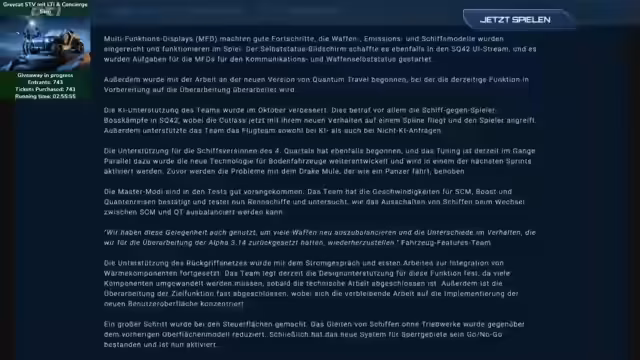 01:48:09Ein großes LTI (Lifetime Insurance) Giveaway für einen Greycat STV wird gestartet, das im Stream live gezogen wird. Die Teilnahme erfolgt durch den Einsatz von 500 Stars im Channel. Geplant ist auch ein Spendenziel für den Kauf einer Nvidia 4090-Grafikkarte, um einen neuen Stream-PC zu bauen, was wegen des AV1-Codec eine signifikante Verbesserung für das Streamen bedeuten würde. Das PTU-Update 3.17.4 wird für heute oder morgen erwartet, ist aber noch nicht bestätigt.
