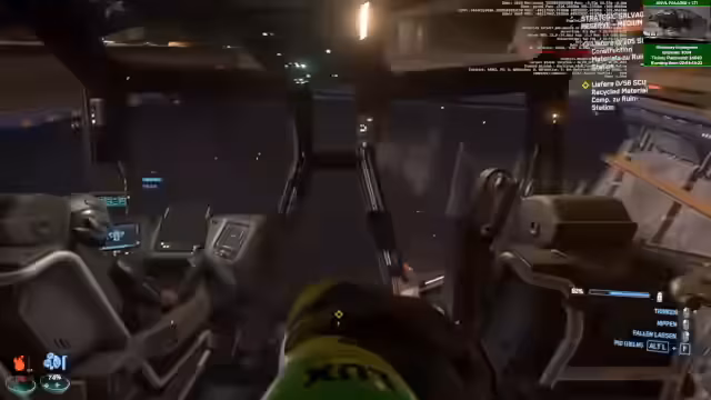 01:11:44Nach den technischen Problemen konzentriert sich der Stream wieder auf das Gameplay. Der Streamer zeigt die Erledigung von Raffinerie-Aufträgen und beendet die noch mögliche neue Quest, um Punkte für Skins zu sammeln. Im Gespräch mit der Community wird eine Vision für ein zukünftiges Schiff geteilt: ein kleinerer, fliegender Händler ähnlich der Merchantman, der an Orten landen kann und NPCs mit einem integrierten Shop beliefert.
