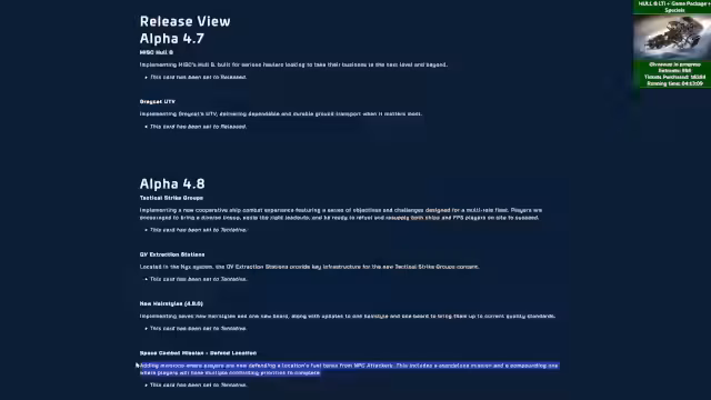 03:47:16Die offizielle Roadmap für Patch 4.8 wird vorgestellt und erfreut Zuschauer und Streamer gleichermaßen. Der wichtigste angekündigte Inhalt ist ein neuer, instanzierter Space-Raid, der als Dungeon-ähnlicher Endgame-Inhalt dienen soll. Weitere Neuerungen umfassen die Einführung von QV-Extraktionsstationen für neue Missionen, bei denen Spieler NPC-Angriffe auf Verteidigungspositionen abwehren müssen, und der Einbau von XAR-Plasma-Granaten. Es wird betont, dass mit dem neuen Transportsystem die technischen Voraussetzungen für diese instanzierenden Inhalte vorhanden sind.