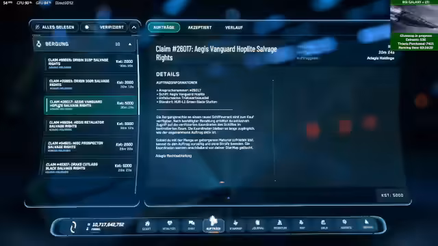 01:38:46Die Spiel-Session startet mit Fokus auf Industrie-Gameplay, Open-World-Content und Plünderung. Ausgewählt wird eine Hercules M2 für Bergungsquests. Explizit wird die Aegis Vanguard Hopelight als lohnendes Ziel genannt: Ihre Military-Komponenten (Power Plant, Schildgenerator, Kühler) können ausgebaut und in andere Schiffe eingebaut werden, um Schiff-HP um 20–25% zu steigern.