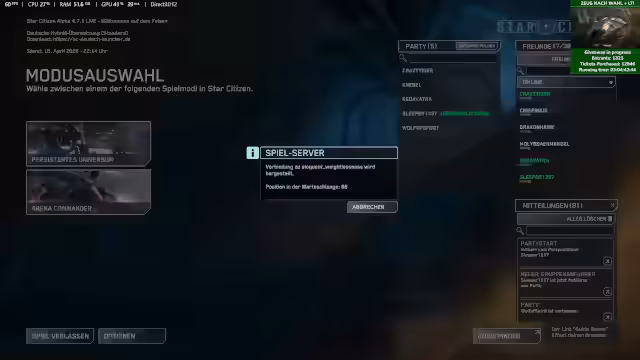 00:00:00Der Stream wurde gestartet und begrüßt Zuschauer zum Wochenende. Es wird Gameplay in Version 4.7 von Star Citizen gezeigt, während auf Version 4.8 gewartet wird, die eigentlich für den Evocati PTU erwartet wurde. Der Streamer plant, einen Live-Evocati-Report durchzuführen, falls möglich. Es wird angedeutet, dass ein Experiment mit dem ATLS-Traktorstrahl gezeigt wird, wie man diesen an Raumschiffe anbringen kann. Außerdem werden Activities wie das Aufsuchen von A Valakar Perlen und das Sammeln von Ruf erwähnt.