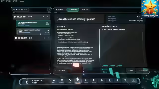 00:22:21Es wird direkt ins Spiel eingestiegen, um die neuen Quests des Frontier-Fighters-Events zu testen. Der Streamer gründet eine Gruppe, um Missionen gemeinsam zu erledigen und die Belohnungen zu maximieren. Währenddessen tauchen diverse Bugs auf, darunter fehlende UI-Elemente, persistierende Probleme mit dem Inventar, verbuggte Ferngläser und Instanz-Switching-Probleme im Hangar. Die Missionserfüllung wird dadurch teilweise behindert.