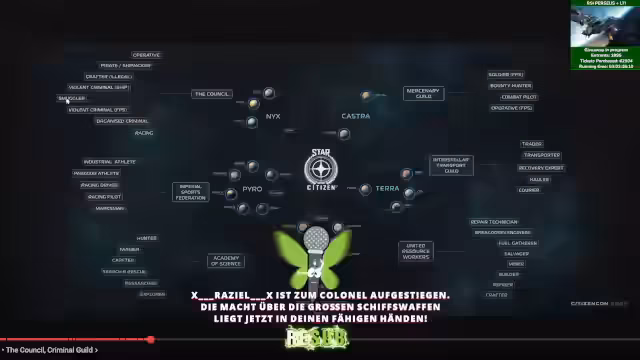 04:43:57Ein Kernbestandteil des zukünftigen Gameplays sind große, übergeordnete Gilden. Diese werden diverse Spielbereiche wie Ressourcenabbau, Transport, Kopfgeldjagd und Söldnerdienste abdecken. Spieler können sich für den Weg in einer Gilde entscheiden, ihren Ruf steigern, Baupläne und Missionen freischalten und so ihren eigenen individuellen Spielstil innerhalb des Sandbox-Universums finden, das durch eine dynamische Story und verschiedene Sternensysteme wie Stanton, Pyro und Nyx geprägt ist.