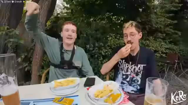 04:52:53Der Streamer macht eine spontane Fahrt mit dem Fahrrad und trifft sich für eine Mittagspause mit einem Kollegen. Währendessen tauchen weitere Gäste wie Schalke Lennart und Evil Jared auf, was zu einem spontanen und surreal anmutenden Wrestling-Moment im Stream führt. Der Streamer beschreibt das Treffen als ultra-geil und eine gelungene Side-Quest und berichtet von seiner Begeisterung für die gemeinsamen Aktionen.