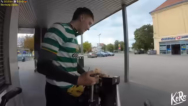 06:43:45Nach ausgiebiger Rast und Energiezufuhr fasst der Streamer den Mut, weiterzufahren. Der Wunsch, mit dem Stuhl an einem schönen Ort die Abendsonne zu genießen, wird zunächst diskutiert, letztlich aber verworfen. Er beschließt, den Müll ordnungsgemäß zu entsorgen und fährt weiter Richtung Halle, als heutiges Ziel. Ein kurzfristiger Plan, nach Leipzig weiterzufahren, wird verworfen, da die Tagesstrecke bereits als ambitioniert eingeschätzt wird und die Energielevel noch nicht für eine so weite Strecke ausreichen.