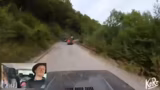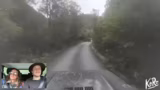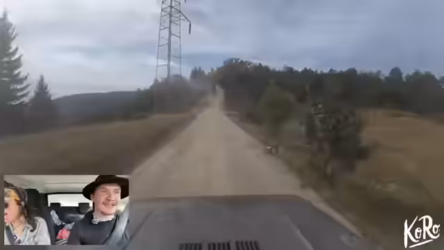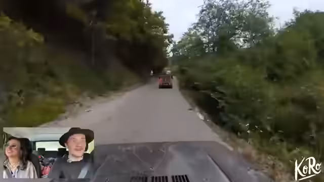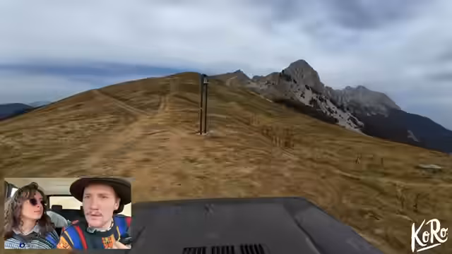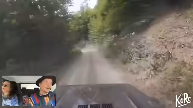 01:24:11Die Streamer bewegen sich auf engen, unebenen Bergstraßen, die durch Waldgebiete führen. Hierbei wird die starke Rüttelung der Fahrzeuge deutlich, die auch die Konzentration auf dem Fahrersitz erfordert. Ein plötzliches Piepsen löst einen Schreckmoment aus, der sich als Bodenwelle herausstellt, gegen die der Wagen mit der Stoßstange anstößt. Die anschließende Staubentwicklung vom vorausfahrenden Fahrzeug ist erheblich und beeinträchtigt die Sicht, was die Expedition zu einer heftigen Offroad-Erfahrung macht.