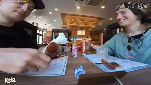 02:29:40Nachdem das Restaurant 'Crime 101' als geeignet befunden wurde, wird das Fahrrad abgestellt und die Helme gesichert. Die Streamer bestellen vegetarische Ramen und Getränke, darunter eine besondere Ramune-Flasche mit einem Aufpoppiel-Mechanismus. Die Essenspause wird genutzt, um die müden Kräfte zu tanken und auf die Weiterfahrt nach Florenz vorzubereiten.