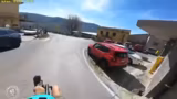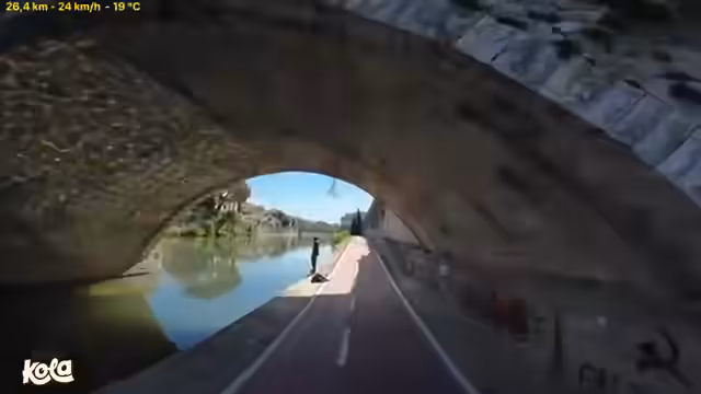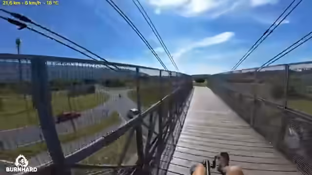 00:54:51Der längste und steilste Teil der heutigen Etappe ist eine zehn Kilometer lange Abfahrt mit 1000 Höhenmetern. Dies erweist sich als große Belastung für die Bremsanlage des Fahrrads. Die Scheibenbremsen werden extrem heiß und verlieren an Bremskraft. Der Streamer muss eine spezielle Stotterbremse anwenden, um die Kontrolle zu behalten, und muss dabei auch auf den entgegenkommenden Verkehr achten.