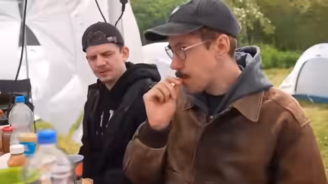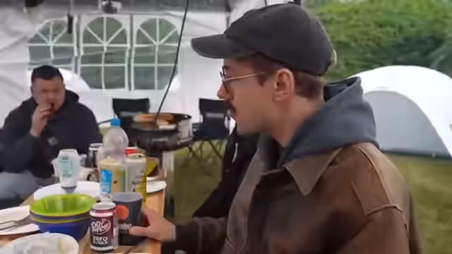 07:43:51Das Wetter stellt die Streamer vor Herausforderungen, als der Regen unangenehm wird und sich die Kälte breitmacht. Der Wechsel von trockener zu nasser Kleidung wird zum Thema. Die Organisation gestaltet sich chaotisch, es geht hin und her zwischen verschiedenen Orten wie Catering, Bussen und Zelten. Das Tragen von Ponchen hält die oberen Körperpartien trocken, doch die Beine bleiben nass. Die launische Stimmung spiegelt die Wetterbedingungen wider und der Geplänkel um Transportmöglichkeiten und trockene Plätze ist ständiger Gesprächsstempel.