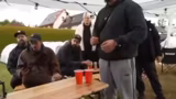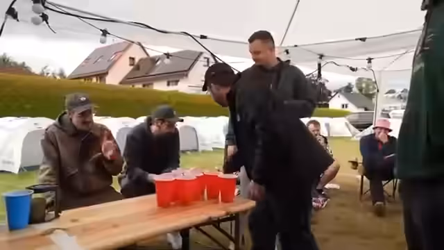 01:56:42Nach einem technischen Problem wird das Bierpong-Turnier fortgesetzt. Die finalen Regeln werden klargestellt: Ellenbogen dürfen nicht über die Tischkante, bei einem Treffer muss ein Becher getrunken werden, und bei einem Doppeltreffer drei Becher. Das Turnier zwischen den Teams beginnt, und auch ein spontaner Contest, wer die anderen Teammitglieder wie Max oder Sascha am einfachen hochheben kann, sorgt für zusätzliche sportliche Unterhaltung und Gelächter.