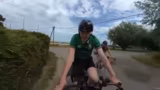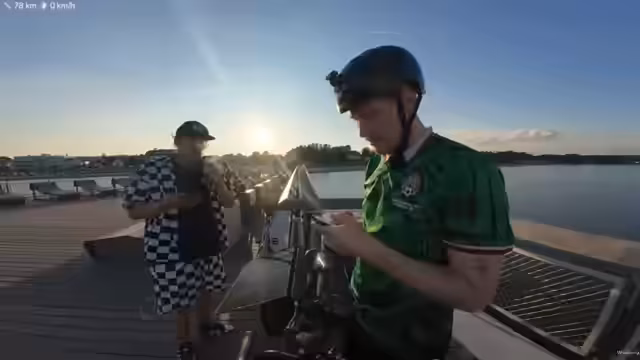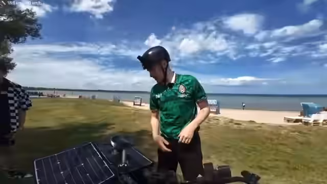 05:58:29Ein zufällig auf der Tour antreffender Mitfahrer namens Hugh stößt zum Stream dazu. Die Route führt durch eine Apfelallee und am Meer entlang. Der Streamer platziert dabei ein Solarpanel, um seine Geräte zu laden und stellt eine Verbindung zu E-Bikes her. Er berichtet von positiven Reaktionen von Passanten und bewirbt die Technologie als Zukunftsoption für nachhaltiges Reisen.