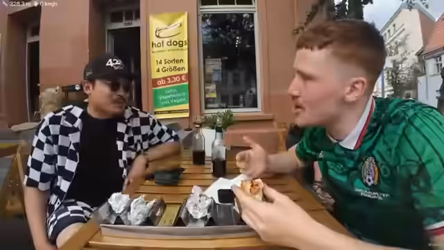 00:38:53Eine besondere kulinarische Station des Tages ist ein Hotdog-Laden in Wismar, der 14 Sorten und 4 Größen anbietet. Die Bestellung umfasst einen XXL Hotdog von 30 cm Länge mit sechs Bratwürsten, was die '3000 Kalorien Challenge' darstellt. Der Preis von 11 Euro für den Fleisch-Dog wird im Chat kritisch diskutiert. Nachdem der Streamer das gewaltige Gericht geschafft hat, bewertet er es mit 5 von 7 Punkten. Der Verzehr wird als bemerkenswertes Erlebnis des Tages erwähnt, das ihm Kraft für die weitere Strecke verleihen soll. Die Essenspause dient als wichtige Energiequelle für die anstehende Radfahrt.