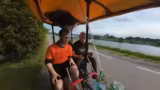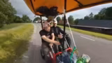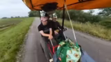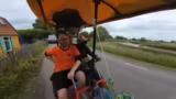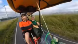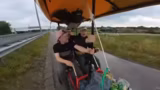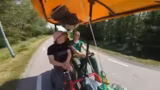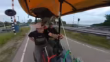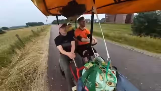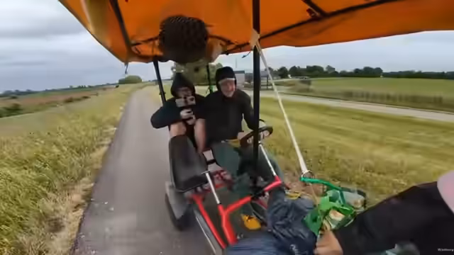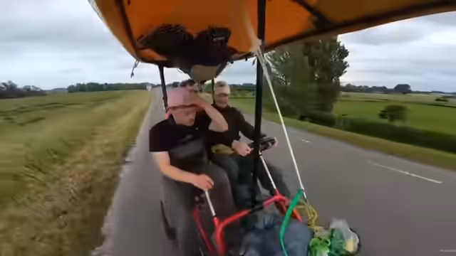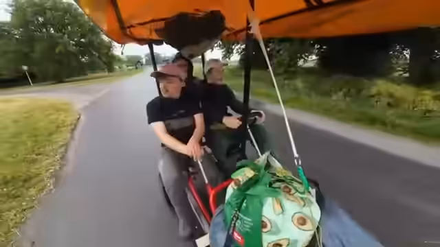 07:30:15Das Tempo des Kettcars wird auf bis zu 27 km/h gesteigert, was die Bremse stark beansprucht. Ein Hügel, der als extrem steil wahrgenommen wird, muss genommen werden. Es wird über die geplante Fahrradtour nach Berlin und mögliche Startpunkte wie Münster diskutiert. Die Energiekosten für die Tour werden thematisiert.