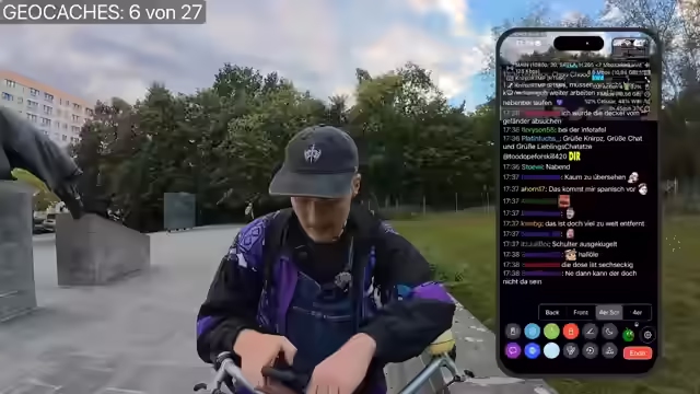 03:41:58Valorant spendet eine Subbombe und Uli Schwert wird für einen Sub gedankt, wodurch die Gesamtzahl auf 27 steigt. Es wird erwähnt, dass bei sieben erreichten Caches nur noch 20 weitere benötigt werden. Matze wird gegrüßt und es wird erklärt, dass der Stream aufgrund technischer Probleme, insbesondere einer defekten Kamera und nicht aufladbaren Akkus, nicht so lange dauern kann. Trotzdem werden sechs von 27 Geocaches angepeilt. Der aktuelle Standort wird als Bushaltestelle beschrieben, während auf den Bus gewartet wird. Es wird festgestellt, dass das GPS-Signal falsch ist und das Denkmal der Spanienkämpfer nicht sichtbar ist. Nach dem Zünden eines Hinweises ('Round Metal, look inside') wird die Suche fortgesetzt. Das Denkmal wird schließlich gefunden, aber seine Platzierung wirkt etwas deplatziert. Die Suche nach dem Cache geht weiter, wobei der Hinweis 'round metal, look inside' im Fokus steht. Nach einiger Suche wird der Cache schließlich in einem Gebüsch gefunden.