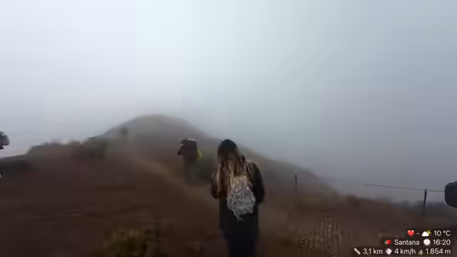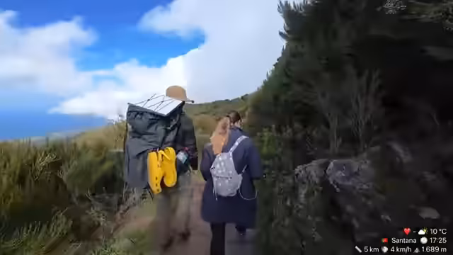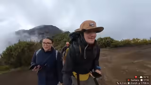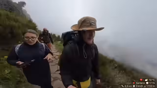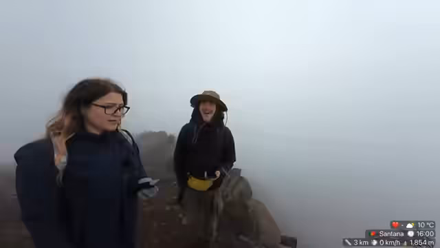 03:54:43Die Streamer bewundern die weite Aussicht und das endlose blaue Meer im Norden, was sie als surreal und mit viel Fantasie verbunden beschreiben. Ein Zuschauer erklärt das Wetterphänomen: die Wolken hängen wegen der Thermik in den Bergen und die beste Chance für einen klaren Blick vom Berg besteht am Vormittag, da sich am Nachmittag oft Wolken bilden. Als Bildungskanal werden die Lerninhalte erwähnt. Anschließend wird Danny sein Aussehen und den Rucksack vorgestellt, den er auf Madeira neu kaufen musste, und es gibt eine Warnung vor Sturm.