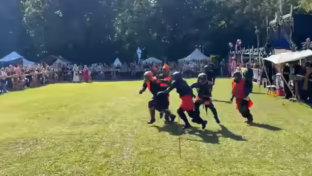 01:31:59Das Spiel zwischen Maximal Royal und dem Orden der Vergeltung beginnt mit einem riskanten Fahrradwurf. Harte Tacklings führen zu einem Punkt für ein Team und einem Sanitätereinsatz. Ein Teilnehmer wirft sein Fahrrad wütend weg. Trotz des harten Wettbewerbs herrscht ein freundschaftliches Miteinander. Ein Mitglied von Team Maximal Royal verletzt sich und kann sein Bein nicht mehr bewegen. Das Publikum sendet Genesungswünsche. Der Moderator erklärt die Regeln des laufenden Spiels: Drei gegen drei, Ball sichern und in die Endzone bringen. Team Sockenschuss zeigt einen beeindruckenden Start mit einem gelungenen Turn und sichert sich den Punkt.