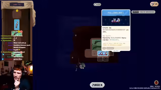 07:45:13Der Streamer steigt im Level auf und erhält neue Items. Er experimentiert mit dem Kombinieren von Gegenständen, um deren Wirkung zu verstärken - zwei grüne Rollerblades werden zu einer blauen Version mit besserer Geschwindigkeit. Er entdeckt die Bedeutung der Sterne bei Items, die erst freigeschaltet werden müssen, um die Boni zu aktivieren. Dabei wirkt er überwältigt von den vielen Optionen und benötigt wiederholt Hilfe aus dem Chat.