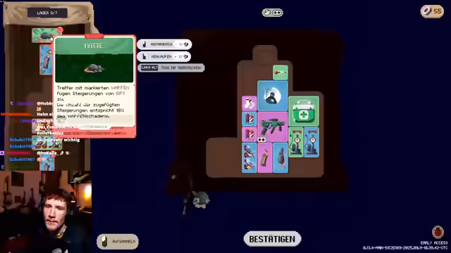 08:26:38Nach erfolgreichem Abschluss des ersten Levels verbessert der Streamer seine Ausrüstung durch Crafting. Er entscheidet sich für die Fahrradpumpe, die den Schaden markierter Waffen erhöht. Er beginnt, das Spiel verstehen zu lernen, indem er die verschiedenen Item-Effekte analysiert und anwendet. Die Herausforderung besteht darin, begrenzten Inventarplatz optimal zu nutzen und die richtigen Upgrades zu wählen. Dabei nimmt er den Zuschauern Input an und versucht, dessen Ratschläge umzusetzen.
