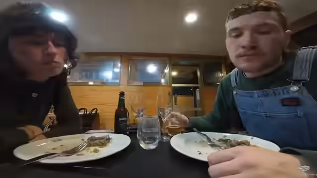 08:10:50Im angepeilten Restaurant angekommen, stellt das Duo fest, dass die Karte fast nur Fisch- und Fleischgerichte anbietet. Die vegetarischen Optionen wie 'Vegetarische Paella' oder 'Reis mit Kohl und weißen Bohnen' werden als unattraktiv und teuer empfunden. Trotz der Spenden im Stream, die das Essen bezahlen sollen, sind die beiden unzufrieden mit der Auswahl und überlegen, ob sie stattdessen kochen sollen.