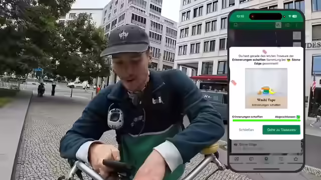 01:18:33Die Suche nach dem Spionagemuseum-Koffer führt durch Berlin-Mitte, vorbei an Sehenswürdigkeiten und der Konkurrenz. Es wird über die Vertrauenswürdigkeit der Menschen diskutiert, die die Koffer finden können. Es stellt sich heraus, dass sich der gesuchte Ort auf der anderen Straßenseite befindet und das GPS nicht richtig funktioniert hat. Es wird ein Geocache entdeckt, eine Little City Tour von sieben Kilometern. Die Frage kommt auf, was Sichthilfe bedeuten könnte, eventuell eine Laterne. Nach kurzer Suche wird der Geocache in einem Spiegel gefunden und geloggt. Es ist der 69. Fund und ein neuer Erfolg wird freigeschaltet. Der nächste Cache, Stone Edge, wird anvisiert, während auf neue Hinweise zur Kofferjagd gewartet wird. Es wird über das Frühstück gesprochen und ein weiteres Fahrrad erwähnt.