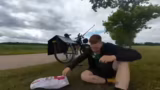 01:57:08Der Streamer gibt einen detaillierten Einblick in seine Ausrüstung. Er fährt auf einem alten Giant-Mountainbike mit speziellen Halterungen für eine Drohne, ein Stativ und sein Smartphone. Die Gepäckverteilung wird erklärt: Werkzeug und Öl befinden sich am Gepäckträger, während persönliche Gegenstände in Taschen an der Vordergabel verstaut sind.