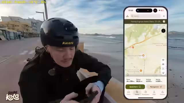05:32:41Die Route für den nächsten Tag wird mithilfe von Komoot geplant, mit dem Ziel Cap Formentor zu erreichen. Es wird eine Route über Pollença mit 66 Kilometern und 1000 Metern Steigung favorisiert. Eine Alternative ist die Fahrt nach Sa Calobra, was eine extrem anspruchsvolle Tour mit 80 Kilometern und 2100 Metern Steigung wäre. Ein entscheidender Faktor ist die Internetverfügbarkeit, die auf dem Bergweg MA10 sehr schlecht ist und die Streaming-Möglichkeit einschränken könnte.