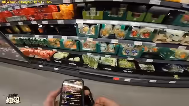 06:50:28Am Abend wird nach einer essbaren Option gesucht, die reich an Kohlenhydraten ist, um sich für den morgigen, intensiven Tag zu stärken. Es wird ein Supermarkt aufgesucht, um Nahrungsmittel wie Tortilla, Nüsse, Datteln und andere energiereiche Snacks zu besorgen. Der Streamer fühlt sich mit dem Fahrrad zunehmend wohler und hat Bock, am nächsten Tag mehr Kilometer zurückzulegen und einen Höhepunkt der Tour zu erreichen.