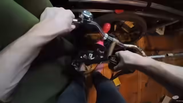 00:03:26Nach einer kurzen Inspektion wird das Tandem zur ersten Probefahrt bewegt. Der Streamer fährt das Rad allein, da der Sitzplatz hinten frei bleibt, und stellt fest, dass es sich trotz seines Zustands fahrbar und stabil anfühlt. Die Gangschaltung, eine veraltete Torpedonabenschaltung, wird getestet. Sie scheint zu funktionieren, ist aber rostig und könnte eine Reinigung und Schmierung benötigen. Die breite Bauart und die Länge machen das Fahren für eine Person eine besondere Erfahrung.