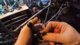 03:05:38Nach mühsamer Arbeit, die oft mit unpassenden Werkzeugen wie Zangen erfolgt, gelingt es dem Streamer, das Hinterrad zu befreien. Als Nächstes nimmt er die Kette ab, indem er zuerst den Kettenspanner löst. Dies eröffnet ihm den Blick auf das Hinterrad und die darin verbauten Kugellager. Diese sind alt und fettig, und eine Kugel geht verloren, was er jedoch als nicht kritisch betrachtet, da neue Kugellager erschwinglich sind.