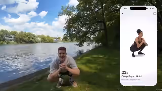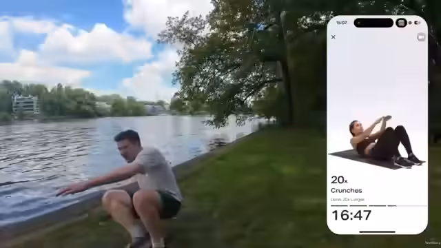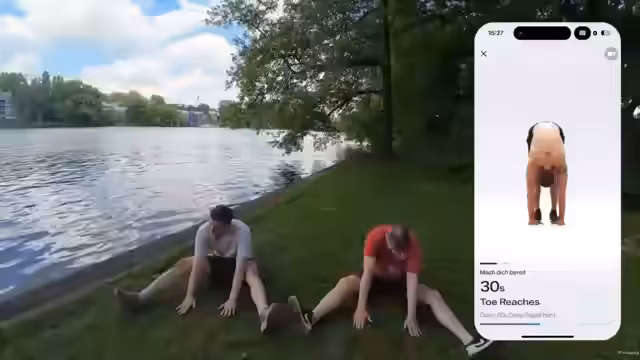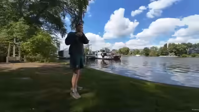 00:26:11Nach der Planung fährt der Streamer zu einem geeigneten Spot für das Workout. Er navigiert durch den Park und sucht nach einem Ort mit guter Internetverbindung, um die App nutzen zu können. Schließlich findet er einen leeren Platz am Wasser mit einer schönen Aussicht, der sich ideal für die Live-Session eignet.