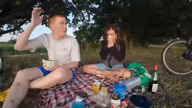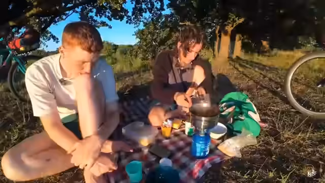 04:28:10Die Radfahrer erreichen ein als Sperrgebiet oder Sprenggebiet gekennzeichnetes Gelände, das sie an die Serie 'Stranger Things' erinnert. Nach 50 Kilometer Fahrt erreichen sie ihr Ziel, einen idyllischen Spot am Wasser. Dort richten sie ihr Lager ein, bauen einen Gaskocher auf und bereiten eine Nudel-Pasto-Mahlzeit zu, während sie den Sonnenuntergen und die美景 genießen.