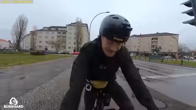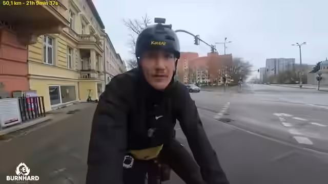 00:53:13Die erste Phase der Fahrt führt den Streamer durch Berlin hindurch, wobei er sich mehrfach in die falsche Richtung verfährt und dadurch extra Kilometer fährt. Nach der Durchquerung Berlins erreicht er Spandau, wo er sich neu orientieren muss. Die Wetterbedingungen sind durchgehend schlecht, was die Herausforderung zusätzlich erschwert. Er befährt holprige und für Radfahrer ungeeignete Wege und muss sein Tempo den Bedingungen anpassen.