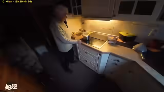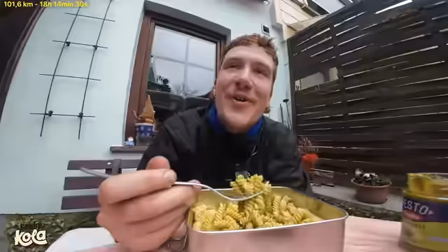 03:21:54Die Wetterbedingungen sind mit Nieselregen und kühlen Temperaturen suboptimal. Trotzdem wird die Fahrt fortgesetzt, da Bewegung der beste Schutz gegen die Kälte ist. Die Ernährung besteht hauptsächlich aus Datteln und Knabe-Cola, um Kohlenhydrate zu laden. Eine Herausforderung ist das Kochen der mitgeführten Nudeln, da kein Kocher vorhanden ist. Der Streamer plant, in einer Ortschaft jemanden zu finden, der ihm die Nudeln aufkochen kann oder spontan auf einem Bauernhof zu übernachten.