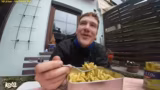 05:12:04Nachdem der Streamer die ersten 100 Kilometer auf dem Tacho hat, macht er an einem Kanalbad halt für ein kurzes Bad und Video-Material. Dabei stellt er fest, dass er Hunger hat, da er nur unvollständig vorbereitete Nudeln ohne Kocher dabei hat. In der Hoffnung auf Hilfe überlegt er, bei zufällig angetroffenen Personen am Wegesrand, insbesondere bei älteren Damen, um etwas warmes Wasser für die Nudeln zu bitten, um so den Hunger zu stillen und das Material für das Video zu sichern.