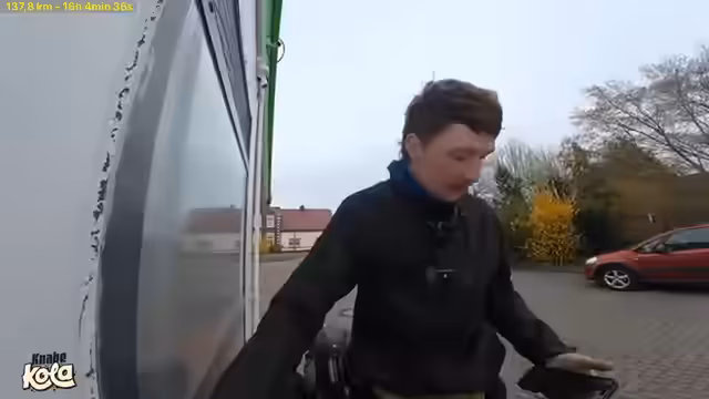 19:18:09Der Streamer beginnt den Morgen nach einer ungemütlichen kalten Nacht im Zelt im Garten und muss nun seine Sachen für die Weiterfahrt packen. Er steht früh auf, um seinen Zeitplan für den Tag einzuhalten. Vor der Abfahrt treten technische Schwierigkeiten auf, da seine Action-Cam nicht mehr per Bluetooth mit dem Handy verbunden werden kann. Nach mehreren Versuchen, das Problem durch Neustarts und das Zurücksetzen von Verbindungen zu beheben, greift er auf eine ältere 5er-Action-Cam zurück, um die Fahrt fortsetzen zu können.