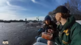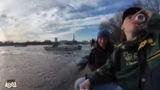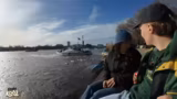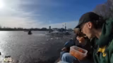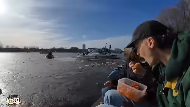 00:43:43Die beiden beobachten ein Boot, das versucht, durch eine Eisschicht zu fahren. Dies führt zu aufregenden Kommentaren und Spekulationen über den Erfolg des Manövers. Das Boot gibt zunächst den Versuch auf, startet aber erneut mit Anlauf. Die Szene erinnert an den "Titanic"-Film und wird als sehr spannend beschrieben.