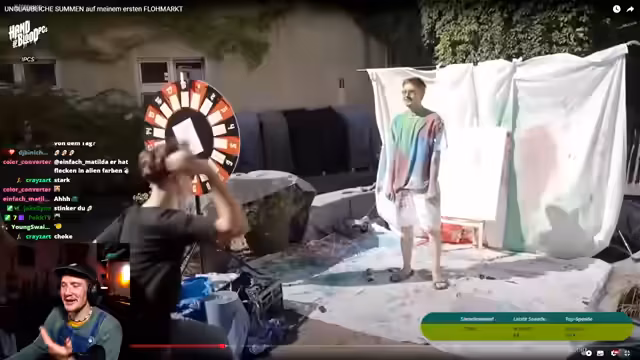 03:23:06Es wird über eine Flohmarkt-Aktion gesprochen, bei der der Streamer mit Farbbomben beworfen wurde. Er berichtet von Schwierigkeiten bei der Umsetzung, da der Stand nicht richtig abgedeckt war und es zu viel gesplattert hat. Trotzdem wurden die Reste der Aktion versteigert, darunter ein Kunstwerk, auf dem alle Lieblings-Creator unterschrieben haben. Die Versteigerung brachte eine Summe von 300 Euro ein, die für einen guten Zweck gespendet wurde. Außerdem wird eine Perücke des Synchronsprechers von Yami Yugi versteigert. Der Streamer bedauert, dass er nicht alle Requisiten versteigern konnte und dass er nicht wusste, dass man vor Ort Marken für Echtgeld kaufen konnte. Insgesamt wurden bei der Aktion knapp 20.000 Euro gespendet. Der Streamer bedankt sich bei allen Beteiligten und kündigt an, in den nächsten Tagen weitere Farbbomben-Aktionen zu starten.