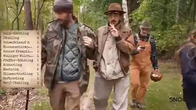 02:43:11Die Gruppe erreicht eine feuchte Lichtung mit Moos, die als Paradies für Pilze beschrieben wird. Hier werden in großer Menge kleine und junge Pilze wie der orangefarbene Hestelnabelling gefunden. Gleichzeitig wird vor der großen Menge potenziell giftiger Pilze wie der Risspilze und Cortinarien gewarnt, die einen intensiven, als spermatisch oder käseartig beschriebenen Geruch verströmen.