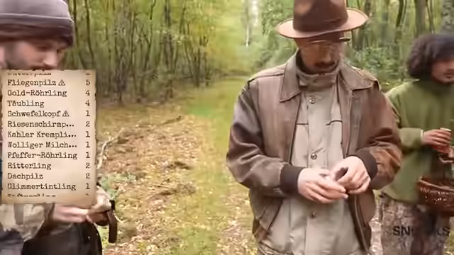 Eine Gruppe, darunter Hänno und Sterzik, begab sich auf Entdeckungsreise in einem als gut geltenden Pilzgebiet. In Begleitung eines Sachverständigen wurde eine Vielzahl an Arten identifiziert. Der Fokus lag auf der sicheren Unterscheidung von essbaren und giftigen Pilzen. Dabei wurden sowohl Speisepilze als auch seltene Funde, wie ein großer Fliegenpilz, entdeckt.