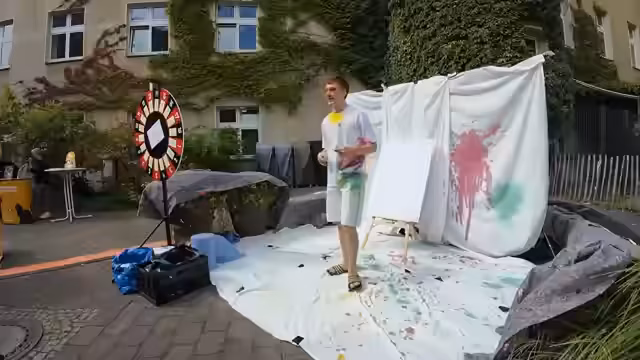 00:24:11Für die Farbbomben-Aktion wurden 300 Stück vorbereitet, die der Streamer persönlich in seiner Badewanne aufgefüllt hat. Er träigt eine weiße Schutzkleidung und eine Schutzbrille, um sich vor Farbe zu schützen. Ein Glücksrad dient als Spielmechanik, bei dem Teilnehmer für fünf Euro drehen können, um ein bis fünf Farbbomben zu gewinnen, die sie dann auf den Streamer werfen dürfen. Die genaue Aufteilung der Felder am Rad wird spontan und gefühlsmäßig festgelegt.