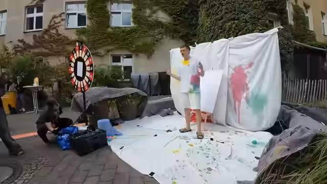 00:48:34Um die Farbbomben effektiver zu werfen, wird eine Schleuder eingesetzt, die von drei Personen bedient wird. Trotz einiger anfänglicher Schwierigkeiten gelingt es schließlich, die Farbbomben mit der Schleuder erfolgreich auf den Streamer zu schleudern. Durch den Beschuss mit den Farbbomben wird die Leinwand beschädigt. Trotzdem wird die Aktion fortgesetzt und die Zuschauer werden weiterhin ermutigt, sich zu beteiligen. Es wird kurz überlegt, die Leinwand zu reparieren, aber letztendlich wird beschlossen, sie so zu lassen, da sie bereits ein einzigartiges Kunstwerk geworden ist. Die Einnahmen aus der Aktion kommen weiterhin dem Tierheim zugute.