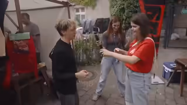 Auf einem Spandauer Flohmarkt gab es eine Farbbomben-Aktion zugunsten von Tieren. Eine Fahrradtour durch Deutschland wurde angekündigt. Kollegen wurden vorgestellt und Nachbarstände besucht. Die Farbbomben-Aktion startete mit anfänglichen Schwierigkeiten, später kam eine Schleuder zum Einsatz. Wegen zu viel Farbe wurde auf Wasserspritzpistolen umgestiegen. Es gab Versteigerungen und Interaktionen mit Zuschauern.