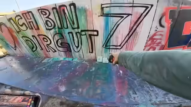 02:42:58Nachdem alle Farbbomben verschossen sind, präsentiert der Streamer das fertige Kunstwerk. Er ist mit dem Ergebnis zufrieden, erkennt aber auch, dass die abgeklebten Buchstaben nicht perfekt haften konnten und das Bild eher als provisorisch und vergänglich zu betrachten ist. Dennoch ist die Aktion aus seiner Sicht ein voller Erfolg, der viel Spaß gemacht hat und zu einem unterhaltsamen Clip geführt hat. Abschließend packt er seine Utensilien zusammen und kündigt an, das Kunstwerk fotografieren zu wollen. Zudem erwähkt er seinen bevorstehenden Auftritt in einem ARD-Talkshow.