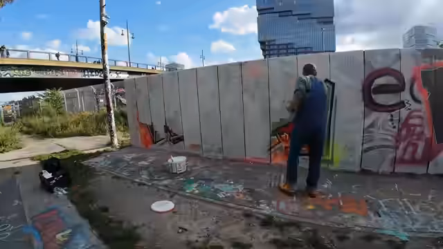 01:01:04Nach der Ankunft an einer öffentlichen Graffitiwand stellt der Streamer fest, dass sie bereits von anderen besprüht wurde. Er beginnt damit, einen Teil der Wand mit der gekauften weißen Farbe zu streichen, um eine Leinwand für sein Projekt zu schaffen. Er experimentiert mit dem Farbauftrag und erhält Tipps aus dem Chat. Der Prozess wird als anstrengend aber Spaßig beschrieben, und seine Mutter und Großmutter schauen dem Ganzen zu.