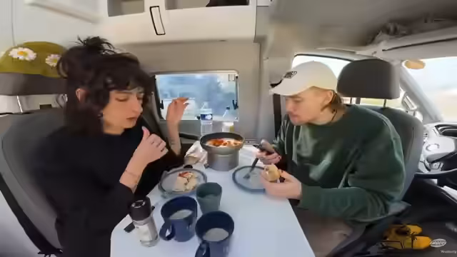 08:30:07Während des Kochens wird bemerkt, dass andere Camper in den Bus schauen können, aber es wird humorvoll darauf hingewiesen, dass die Zuschauer im Stream auch in das Privatleben der Streamer Einblick nehmen. Die Kartoffeln drohen überzukochen, was zu einem kleinen Schreckmoment führt. Gül übernimmt die Aufgabe, die Vorhänge zuzuziehen. Der zubereitete Salat wird als sehr lecker gelobt. Es wird überlegt, was mit dem Schnittlauch gemacht werden soll und wie der Joghurt gewürzt wird. Die Kamera wird abgebaut, um zu verhindern, dass andere sehen, dass es sich lohnt einzusteigen. Statt Joghurt wird Frischkäse verwendet, der als passend empfunden wird. Die Zubereitung des Essens wird als gemeinschaftliches Erlebnis dargestellt, bei dem beide Streamer zusammenarbeiten. Es wird über die Tridem-Tour gesprochen und wie gut der Dip schmeckt. Die Kartoffeln werden auf ihren Garzustand geprüft, wobei Gül ein besonderes Einfühlungsvermögen für die Kartoffeln entwickelt haben soll.