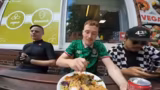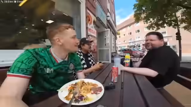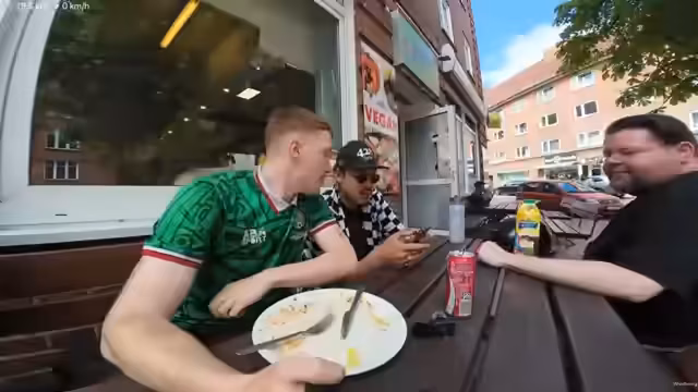 03:14:41Nach der Ankunft in Kiel, der Landeshauptstadt, beschreibt der Streamer die Umgebung und die Vorfreude auf die Kieler Woche. Er sucht nach einem Essensplatz und findet ein türkisch-veganes Restaurant, wo er einen großen Seitan-Teller bestellt. Während der Pause begegnet er einem Zuschauer namens Schini, der ebenfalls Fahrrad fährt und ihm als Pacemaker zur Seite stehen kann. Der Streamer unterhält sich über Fahrradmodelle und plant, den Abend mit dem Zug nach Hause zu fahren.