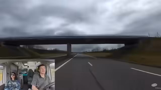 01:05:34Bei der Ausfahrt vom vorigen Rastplatz kommt es zu einer beängstigenden Situation. Ein Betonmischer und Bauarbeiten blockieren die einzige Zufahrtsstraße. Nach kurzer Rücksprache mit den Arbeitern, die die beiden durchwinken, gelingt es dem Wohnmobil nur mit Millimetergenauigkeit, durch die enge, gesperrte Passage zu manövrieren. Dieser Moment wird humorvoll als 'Private Spot mit Security gesichert' bezeichnet.